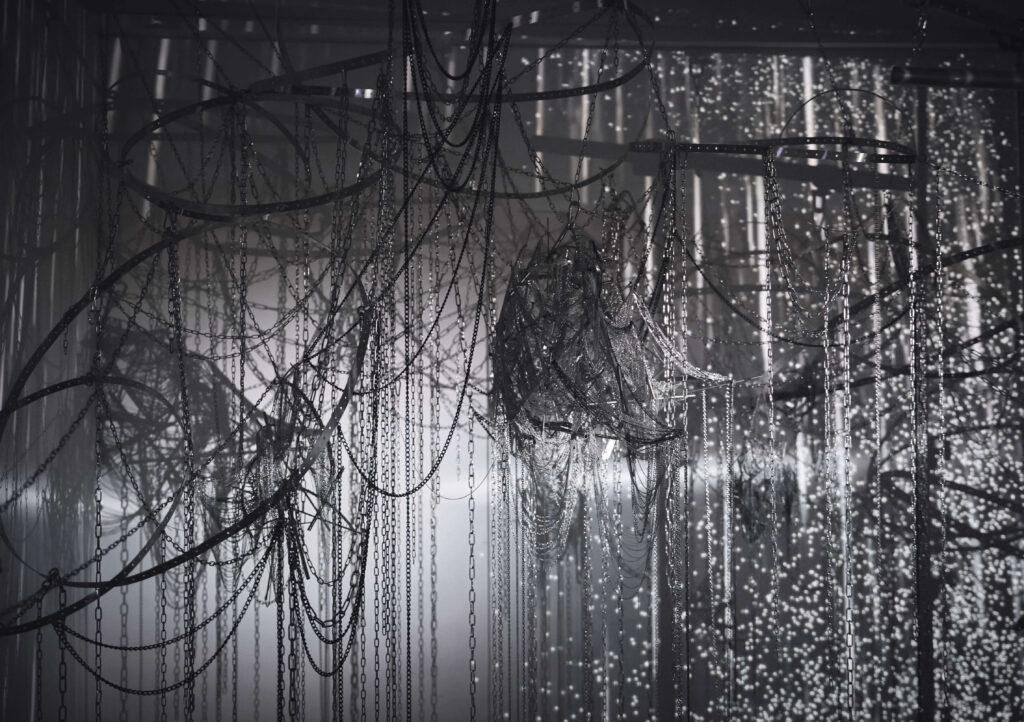 A video-mapped extension of the Veiled series, where the filmed movements of chained structures are projected onto surrounding surfaces, transforming the original wearable pieces into shifting, spatial compositions of concealment and distortion.