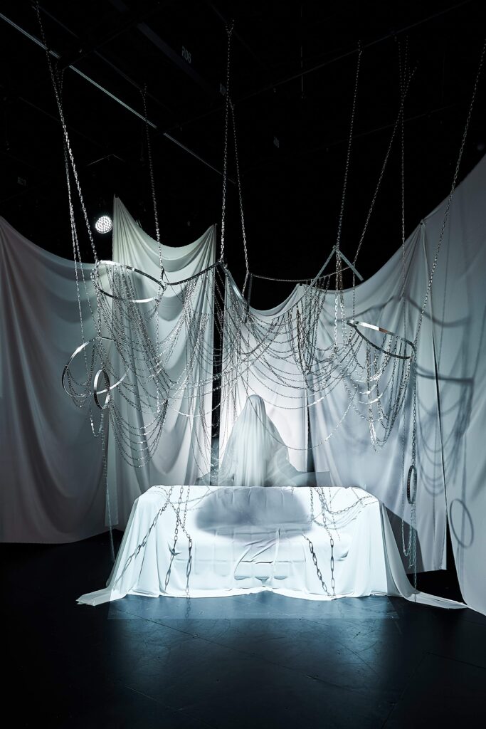 Through shifting light and partial concealment, the work creates an environment where perception becomes uncertain and bodily awareness intensifies.