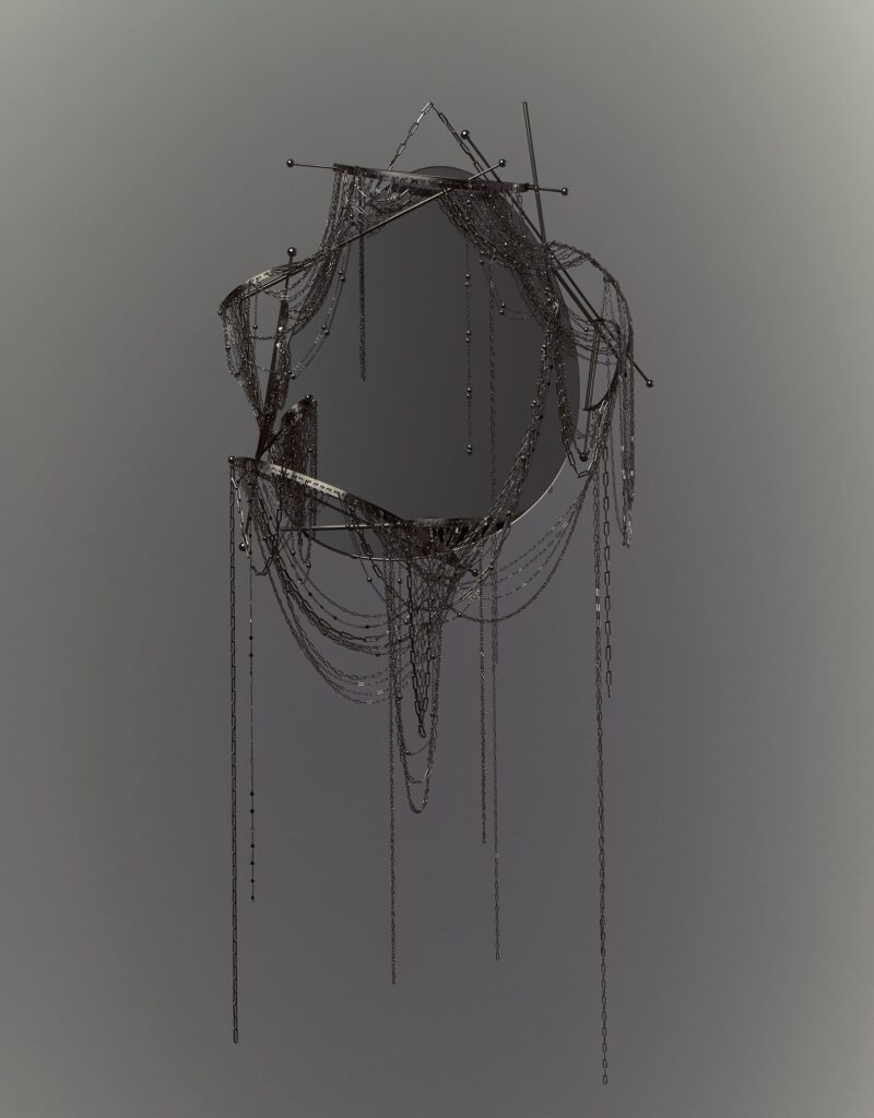 Chains blur and fracture the reflected image, slowing recognition and prompting a more tactile way of sensing oneself. What emerges is not clarity, but the suspended tension between visibility and concealment.